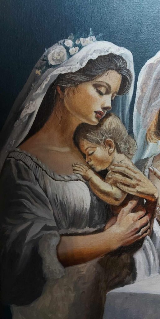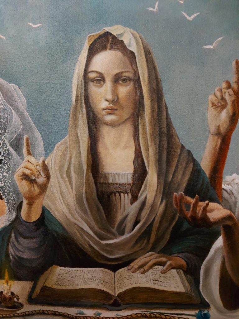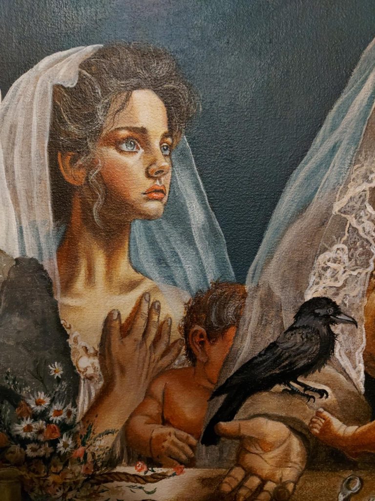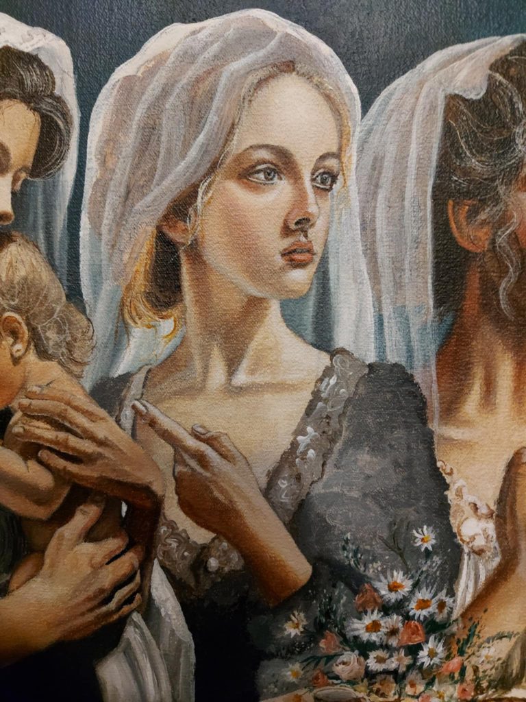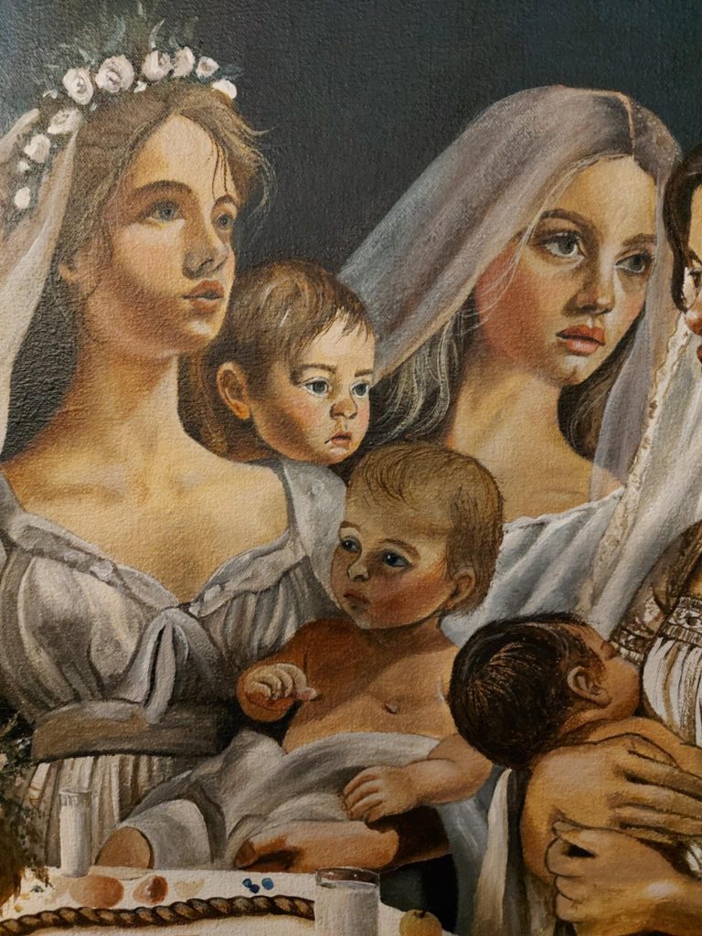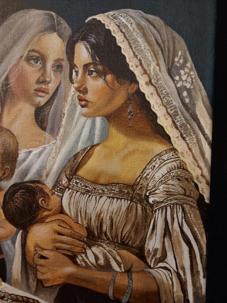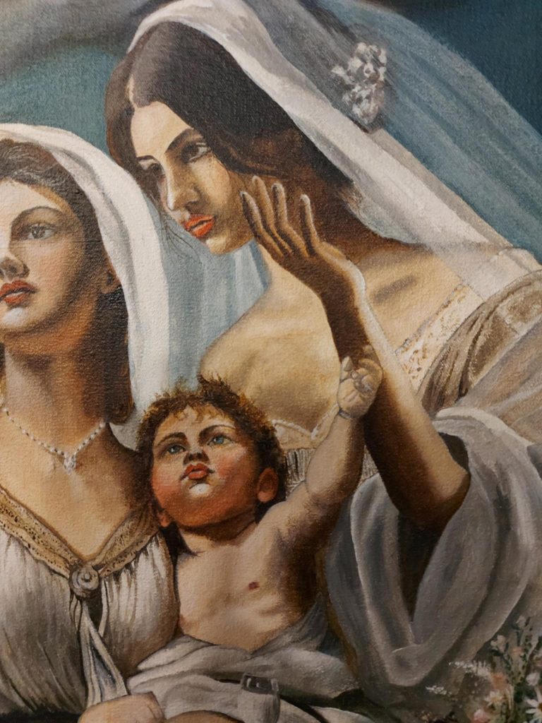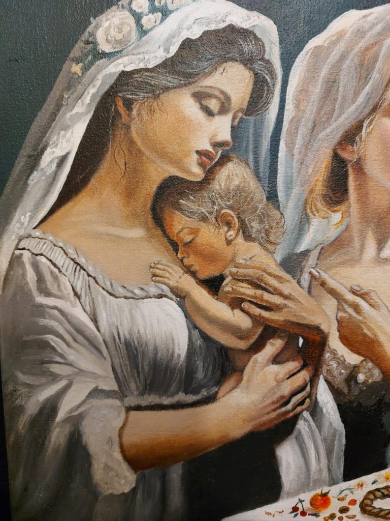 Cette peinture semble explorer des thèmes complexes et universels, tels que l’identité, la parentalité, et les relations sociales, en les plaçant dans un cadre hautement symbolique et spirituel.
