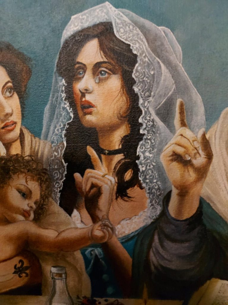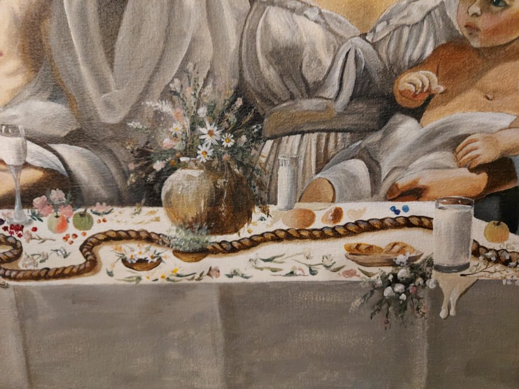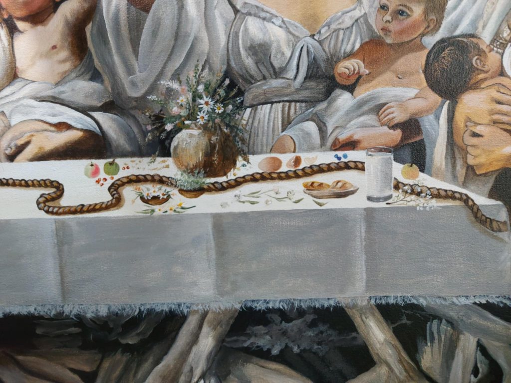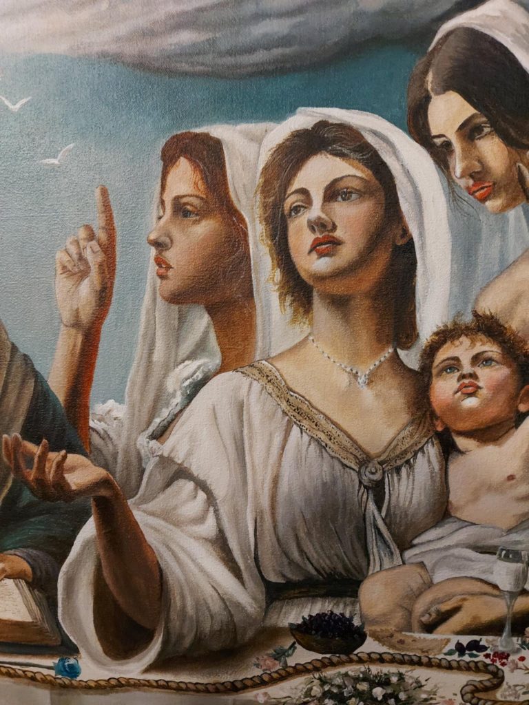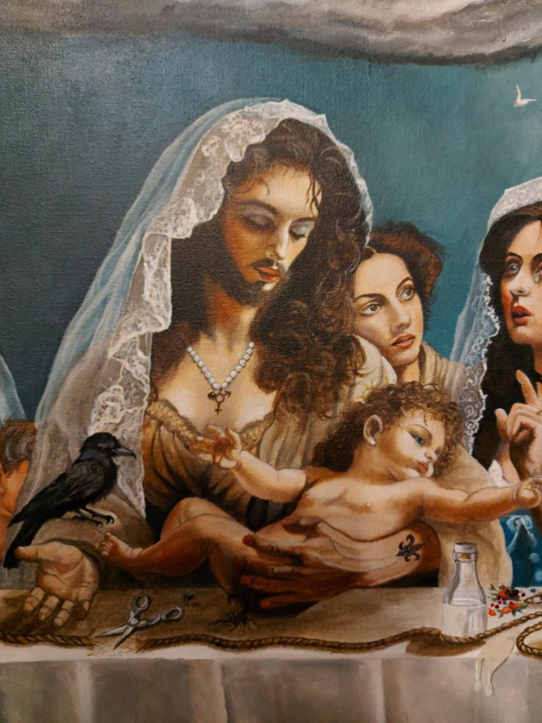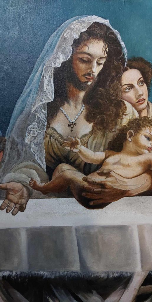 La présence d’un personnage transgressant les normes traditionnelles du genre, tenant un enfant, pourrait symboliser l’évolution des rôles parentaux et des identités dans la société contemporaine. Ce personnage semble se situer à un carrefour d’acceptation et de questionnement. Son inclusion dans une scène aussi sacrée que la réinterprétation d’une Cène invite à réfléchir sur la manière dont les structures traditionnelles intègrent les nouvelles réalités humaines.
