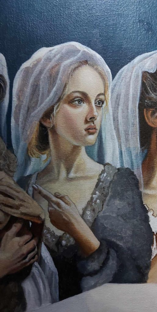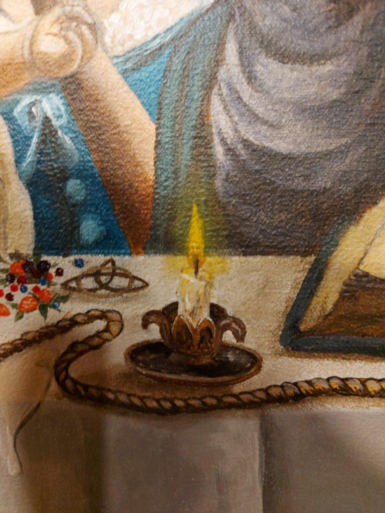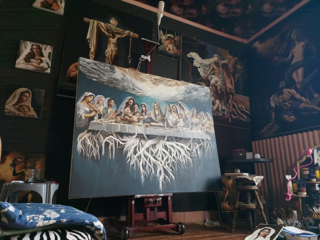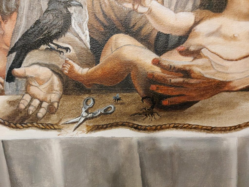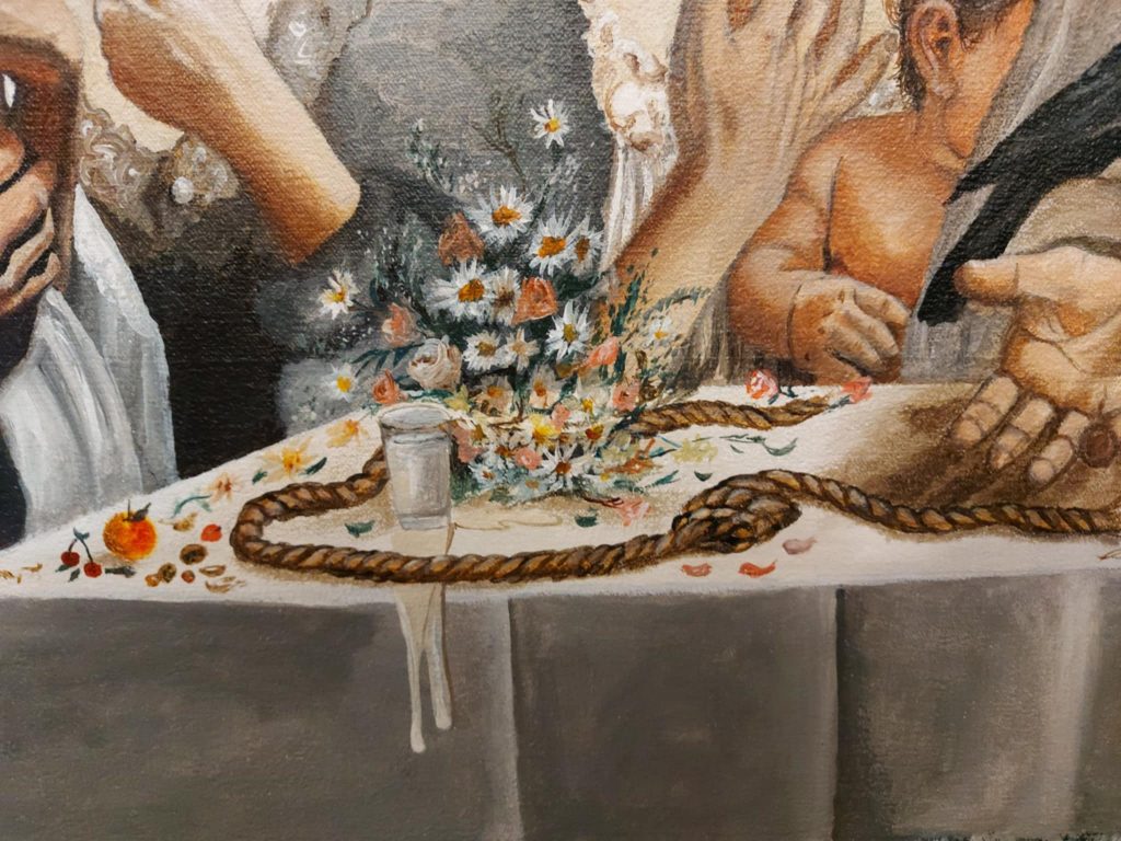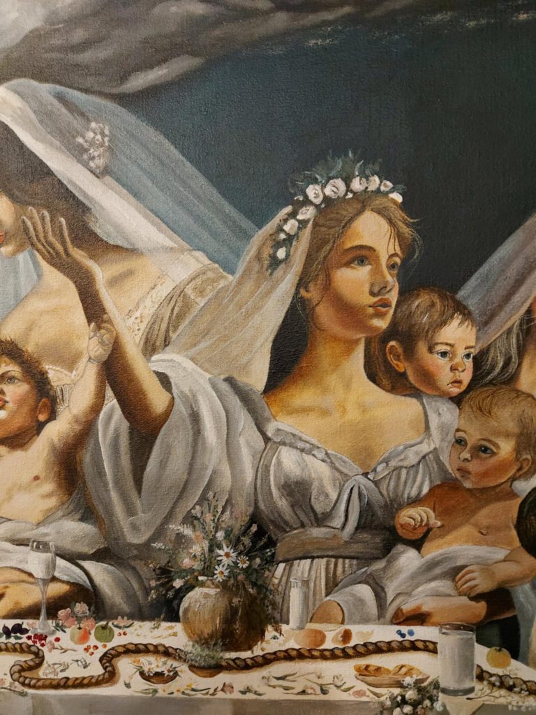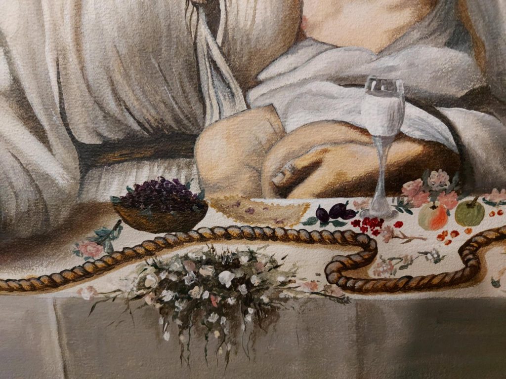 La présence d’un personnage transgressant les normes traditionnelles du genre, tenant un enfant, pourrait symboliser l’évolution des rôles parentaux et des identités dans la société contemporaine. Ce personnage semble se situer à un carrefour d’acceptation et de questionnement. Son inclusion dans une scène aussi sacrée que la réinterprétation d’une Cène invite à réfléchir sur la manière dont les structures traditionnelles intègrent les nouvelles réalités humaines.