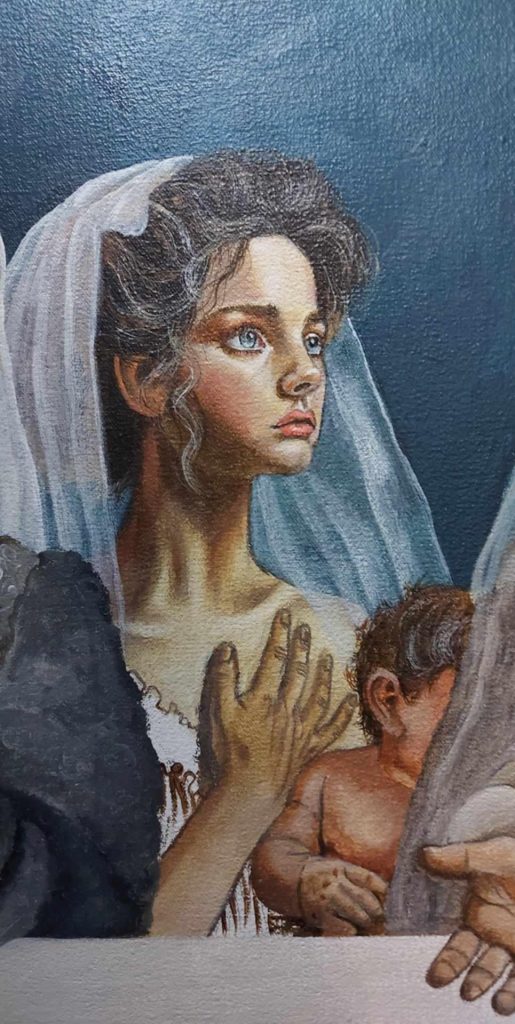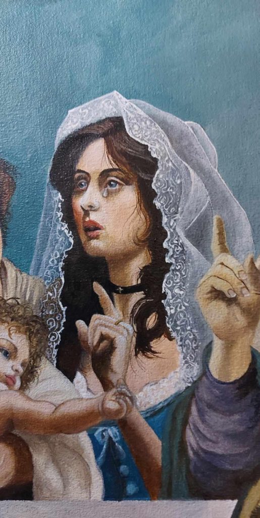 La maternité, omniprésente dans l’œuvre, semble être un fil conducteur. Les nombreuses figures féminines portant ou entourant des enfants renforcent un message de transmission, de protection, mais aussi de tension autour des responsabilités parentales et des normes associées à la maternité. En plaçant le personnage transgenre dans ce contexte, l’œuvre semble poser des questions sur la manière dont la société redéfinit les rôles parentaux et familiaux.