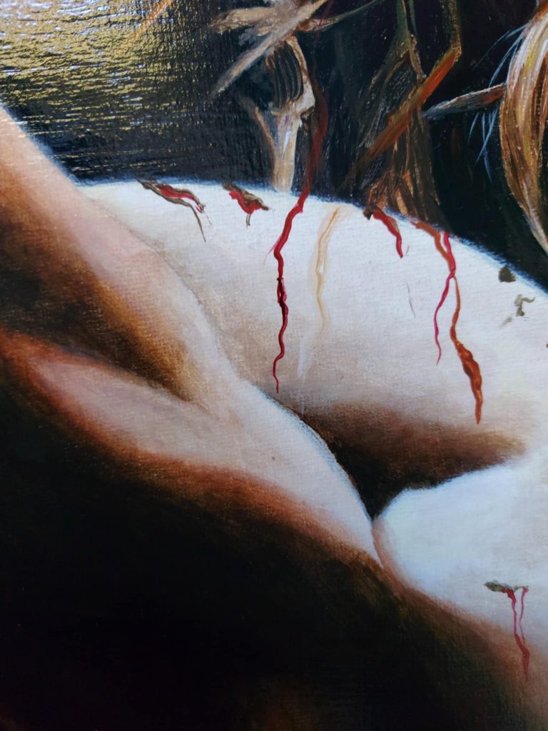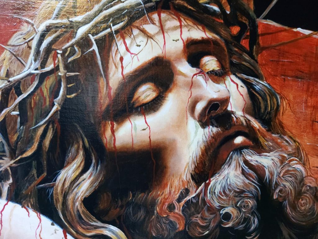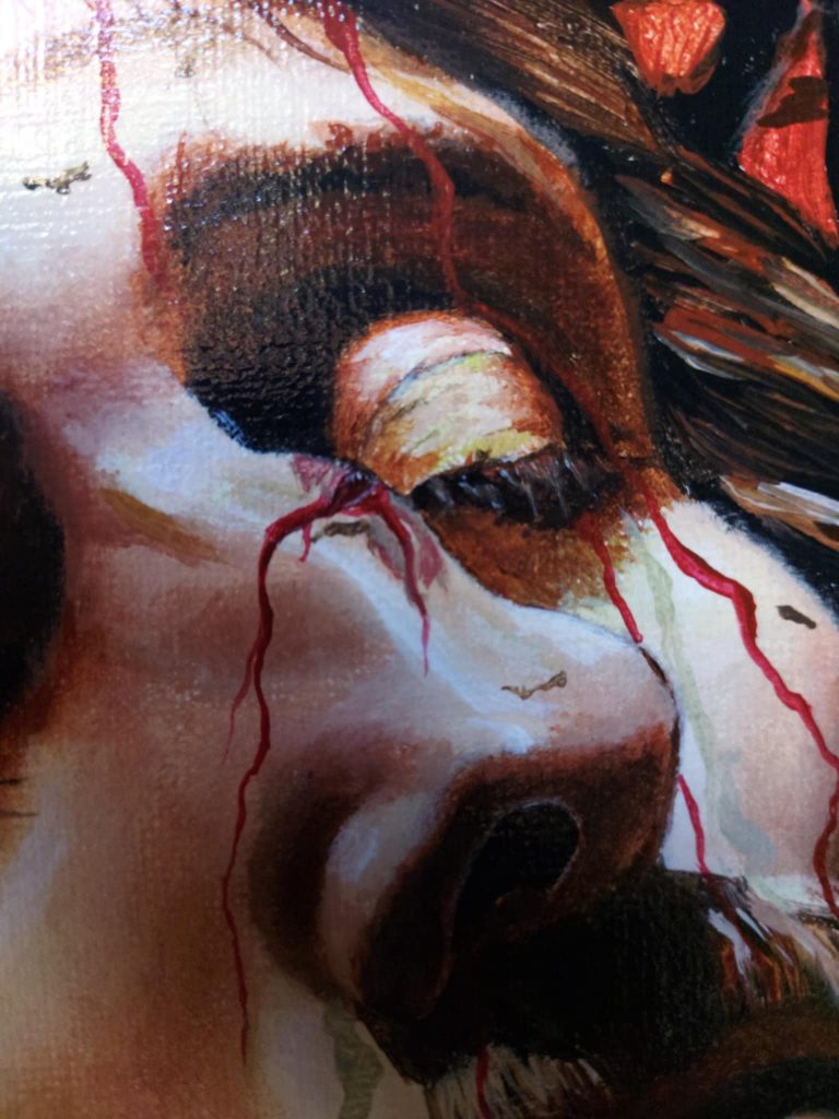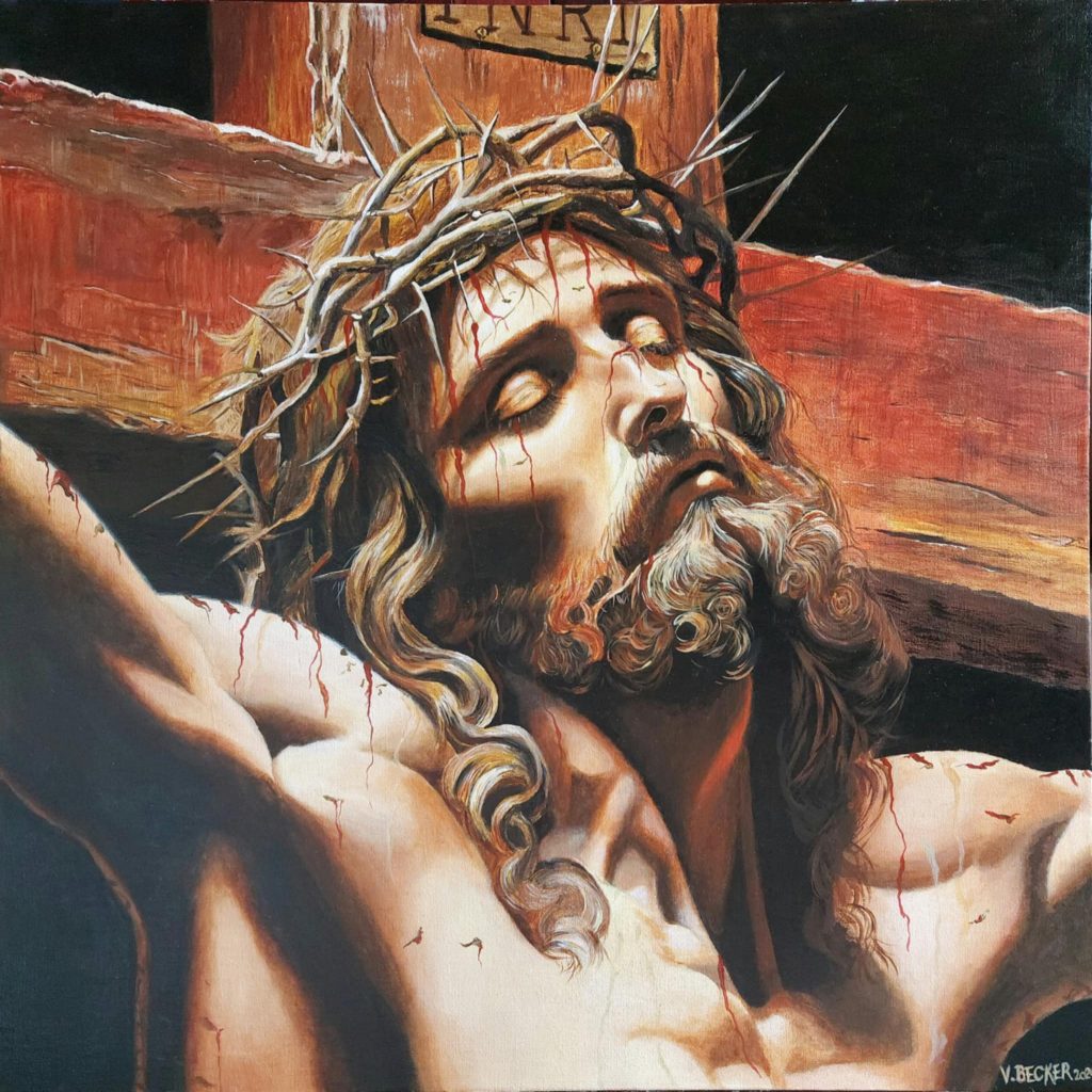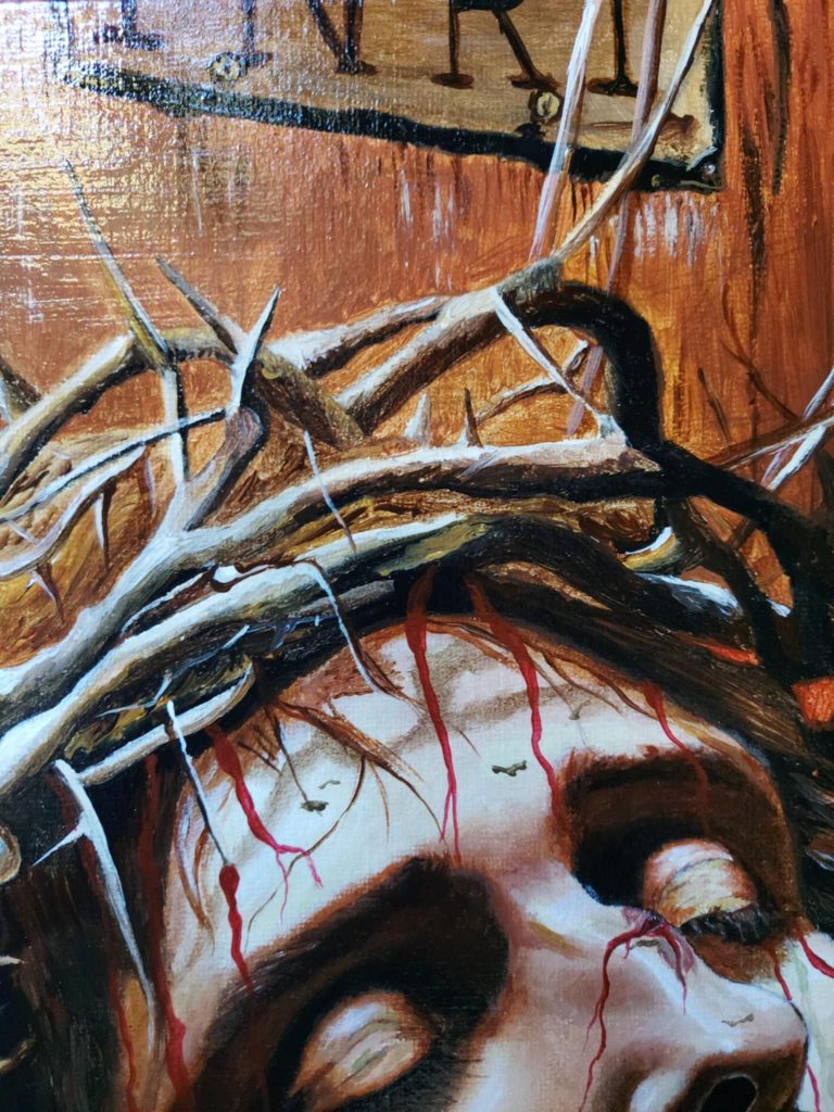 Le visage du Christ, incliné avec les yeux clos, exprime un mélange de douleur et de résignation, soulignant son sacrifice. La couronne d’épines, d’où s’écoule le sang, et les détails des blessures sur son corps renforcent le pathos de la scène. L’arrière-plan sombre met en relief la figure principale, accentuant la tension et la solennité du moment. Ce tableau pourrait également être vu comme une réflexion sur l’endurance face à la souffrance et le triomphe spirituel au-delà de l’épreuve physique.
